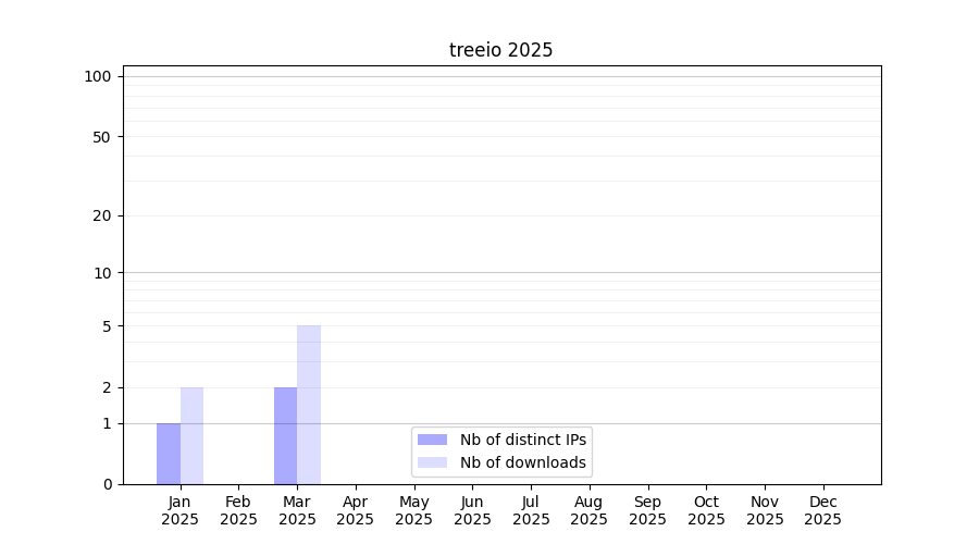 Number of downloads for experiment package treeio, year by year, from 2025 back to 2014 (years with no downloads are omitted):