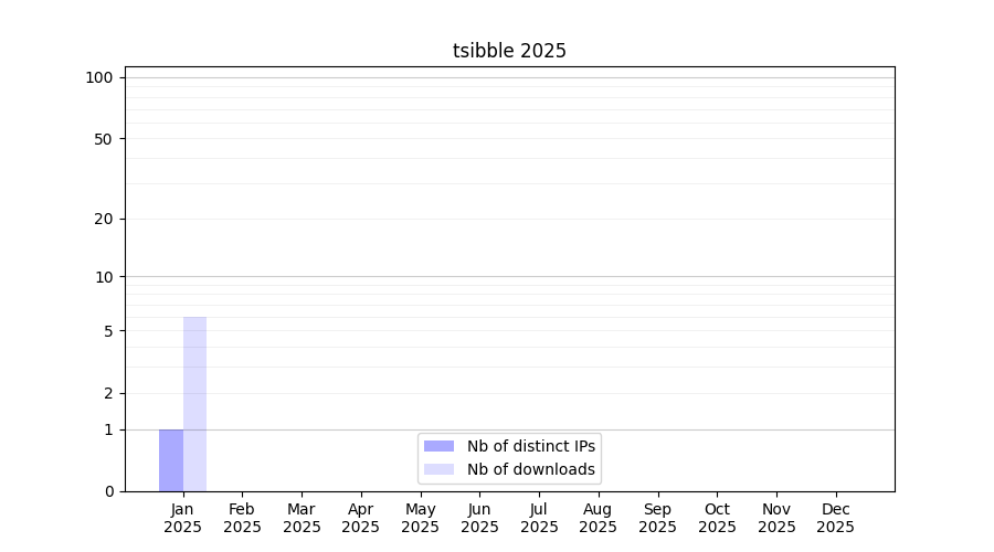 Number of downloads for experiment package tsibble, year by year, from 2025 back to 2014 (years with no downloads are omitted):