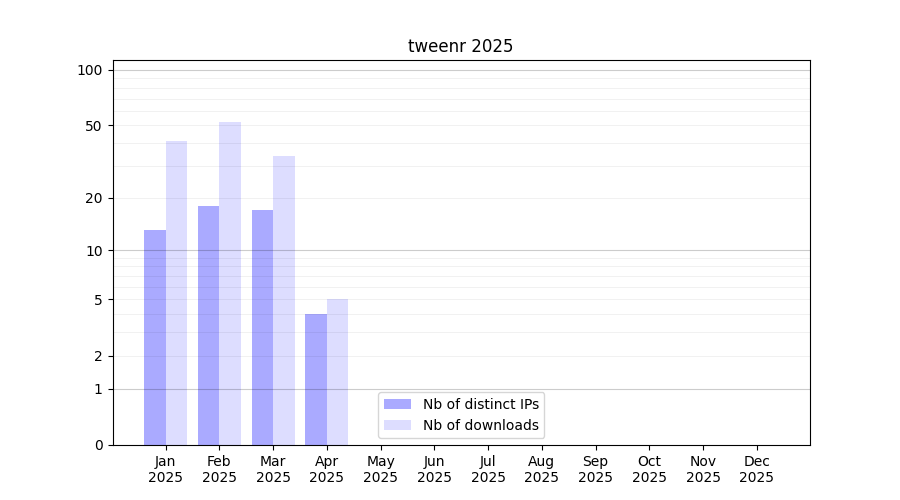Number of downloads for experiment package tweenr, year by year, from 2025 back to 2014 (years with no downloads are omitted):