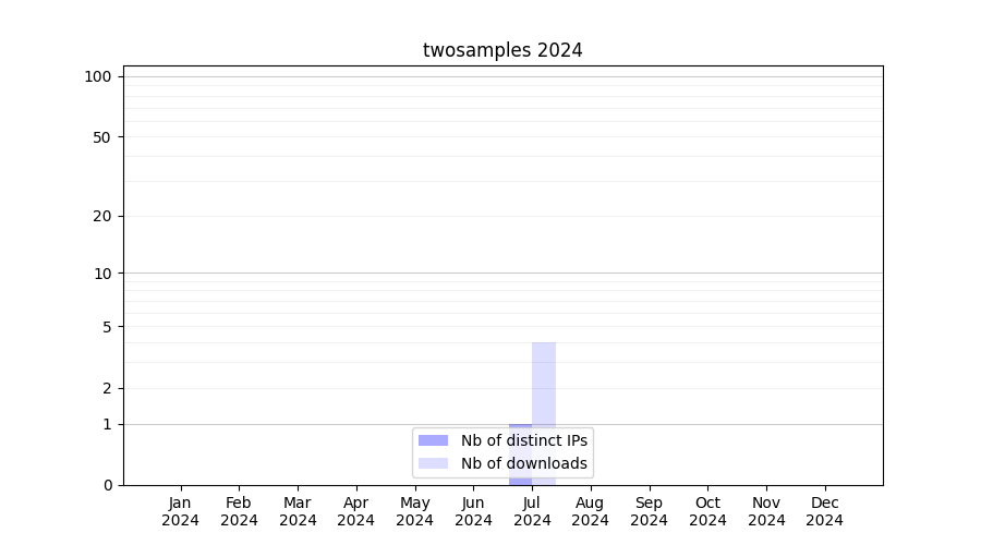 Number of downloads for experiment package twosamples, year by year, from 2025 back to 2014 (years with no downloads are omitted):