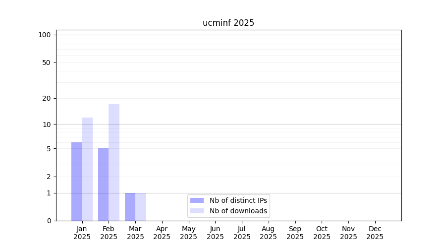 Number of downloads for experiment package ucminf, year by year, from 2025 back to 2014 (years with no downloads are omitted):