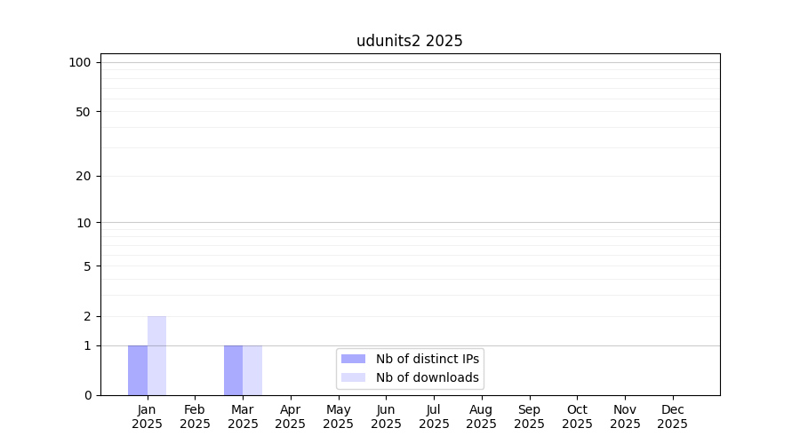 Number of downloads for experiment package udunits2, year by year, from 2025 back to 2014 (years with no downloads are omitted):