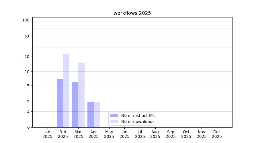 Number of downloads for experiment package workflows, year by year, from 2025 back to 2014 (years with no downloads are omitted):
