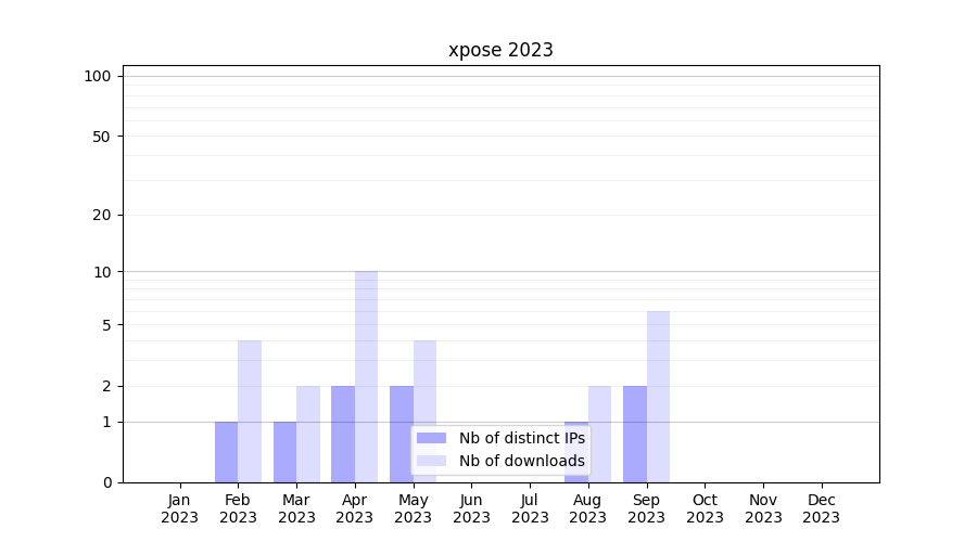 Number of downloads for experiment package xpose, year by year, from 2025 back to 2014 (years with no downloads are omitted):