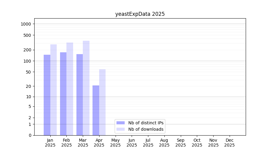 Number of downloads for experiment package yeastExpData, year by year, from 2025 back to 2014 (years with no downloads are omitted):