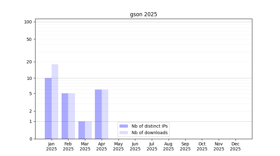 Number of downloads for software package gson, year by year, from 2025 back to 2014 (years with no downloads are omitted):