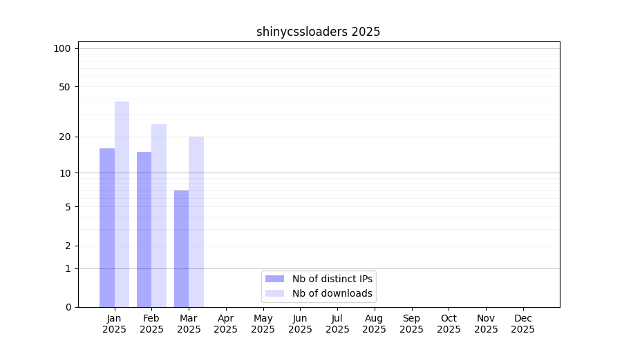 Number of downloads for annotation package shinycssloaders, year by year, from 2025 back to 2014 (years with no downloads are omitted):