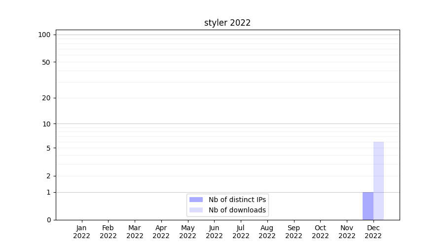 Number of downloads for workflow package styler, year by year, from 2025 back to 2015 (years with no downloads are omitted):